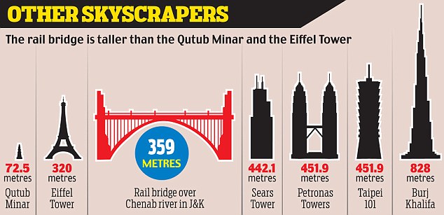 is 35 meters above the Eiffel tower. The world's tallest railroads are inIndia. The reverse 'U' shaped bridge is built on the junction of the Jammu and